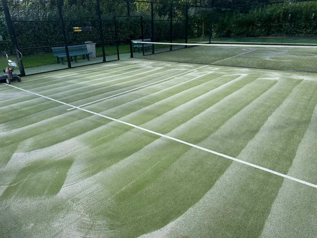 Deze behandeling voorkomt dat de mat hard en glad wordt, behoudt de speeleigenschappen en verlengt de levensduur van de banen aanzienlijk. Wij raden dan ook aan om dit groot onderhoud niet alleen jaarlijks, maar bij voorkeur halfjaarlijks uit te laten voeren. Zo blijft de kwaliteit en bespeelbaarheid van uw padelbanen gegarandeerd optimaal.