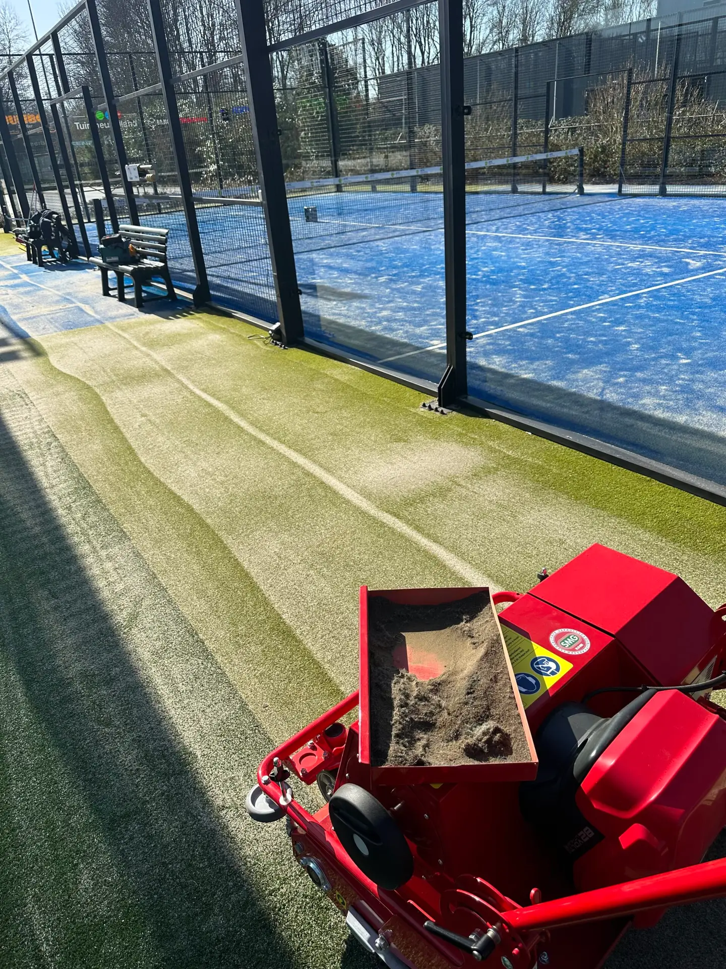 Regelmatig onderhoud, zoals het schoonmaken van de kooiconstructie en het slepen van de banen, kan eenvoudig door verenigingen zelf worden uitgevoerd. Voor een langdurig behoud van de kwaliteit van de kunstgrasmat is echter jaarlijks groot onderhoud essentieel. Tijdens dit onderhoud gebruiken wij de SMG Turfsoft TS2, een geavanceerd apparaat dat de kunstgrasmat vanaf de matbodem grondig reinigt. Hiermee worden alg, stof, zand en ander vuil effectief verwijderd.